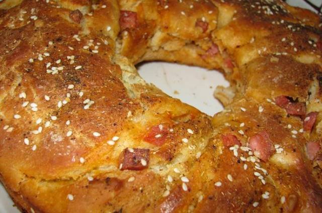 Вместо с крема сирене я намазах с лютеница и поръсих със сирене, салам и шарена сол. Отгоре не съм я мазала с яйце, а само наръсих със шарена сол и сусам. След като се опече я поръсих с прясно мляко.