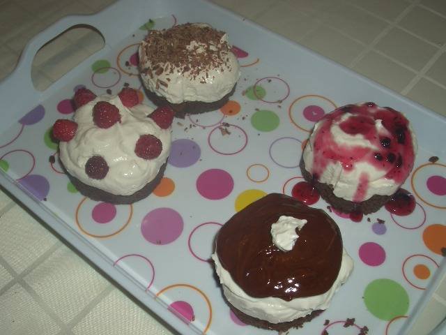 Ами... Embarassed няма рецепта, малко измислица дойде...основата е ясна бисквитки в случая шоколадови натрошени на дребно объркани с разтопено масло. За крема смесих крема сирене, извара и имах сладкарска сметана, добавих и малко пудра захар...на вкус всичко това. Украсата е ясна...както си я измислиш.  Laughing
