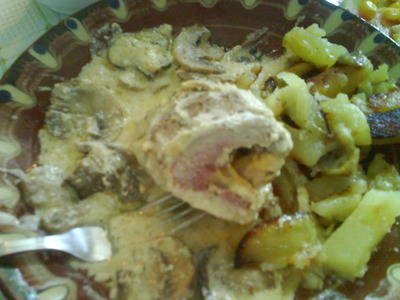 Руладини с бекон, топено сирене, гъбки + сос от синьо сирене, бяло вино и сметана+златистите картофки на Лео.  Снимките не са добри но беше невероятно вкусно.