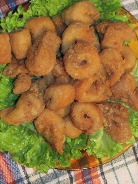 Та.....коремчето се нарязва на лентички,колкото два пръста,посолява се,овалва се в брашно и се пържи.Лентичката като се сложи в нагорещеното олио и тя се навива на охлювче...Както виждаш на снимката ми....