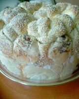 Първата е правена с два реда хоризонтални кифлички Митковата питка  Mr. Green ... в средата плитка плетена с 5 фитила става плоска ..згъват се краищата да стане на топка ,между двата реда кифлички бях сложила розички с лешник но като изчезна крайния  ред кифлички.... розите дойдоха в края Mr. Green Mr. Green