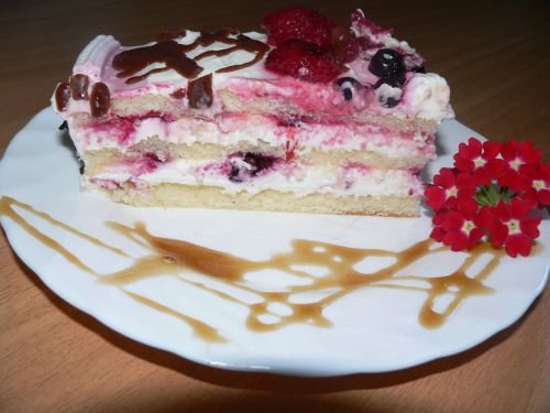 Едната торта е торбичка с пари-пълнежа е ванилов крем с червени боровинки и касис.