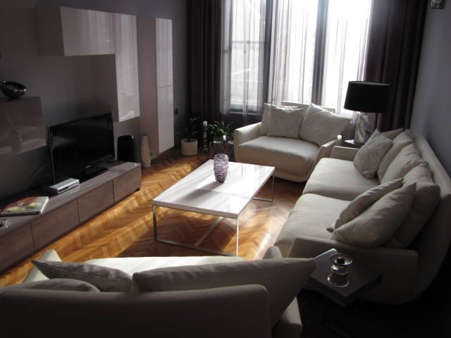 Паркетът си беше запазен и ние единствено го изциклихме и лакирахме. На мен страшно много ми харесват едни бели килими, като за под холната масичка са едни такива рошави, но самата идея колко прах ще събират - изцяло ме отказа. Екрюто няма да е подходящо, защото изпълнението е в бяло и лилаво.