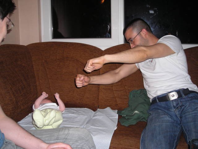 Ясен имитира всичко, което види. Вчера имахме гости и един приятел се занимава с него 2 часа ( кеф... Laughing)... На Ясен, проснат по гръб му се показваше как да се обърна по корем. Аз му викам, че не е възможно но той не се отказа. Разперил ръце и му показва непрекъснато движението. След 1 час ясен започна да си изпъва ръцете като него и след малко се обърна, но главата не успя да я завърти, само до врата Laughing