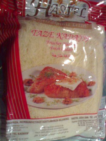 До сега не съм купувала подобен и така както ми изглежда е даже съвсем суров, в смисъл, другия който съм купувала пак не беше на сърми, но имаше вид като на фиде. Ще помоля тези, които имат опит с кадаиф, като този на снимката, да ми кажат дали се приготвя както обикновено, като кадаифа се залива с масло и се пече и т.н. или има нещо по-особено при приготвянето му.