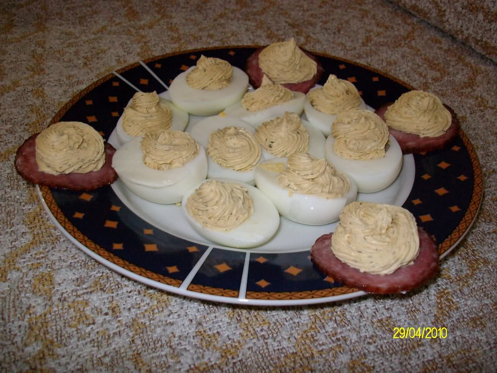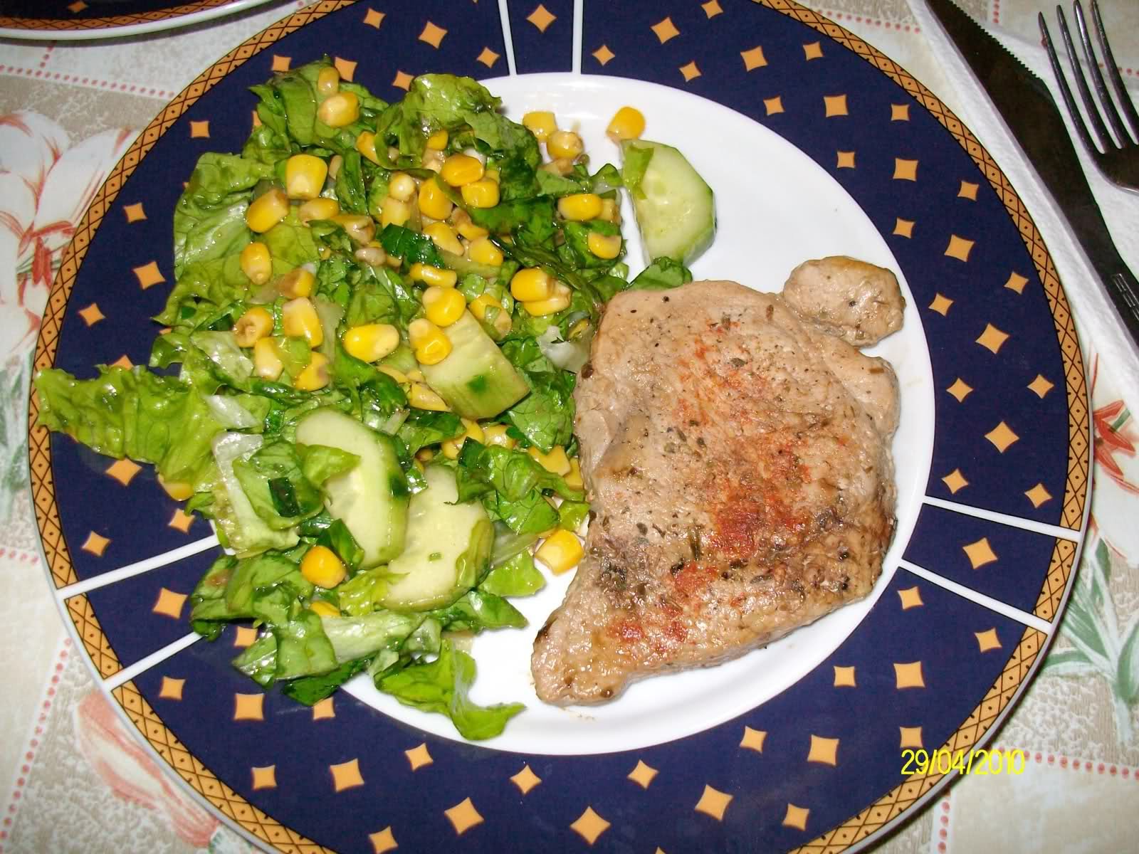 ... преяла съм, а пак огладнях! От мен от предните дни едни пълнени яйца за предястие( купих първия си шприц, та зор да го изпробвам, но има какво още да се желае) и едни свински пържолки на грил тиган с пролетна салатка