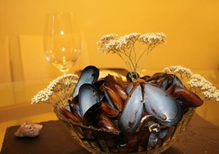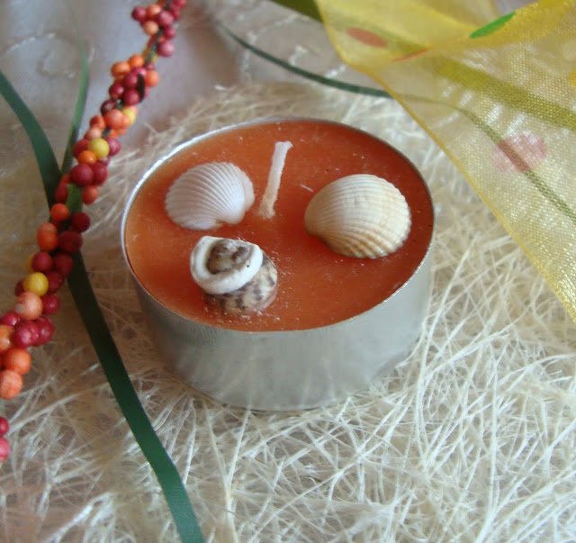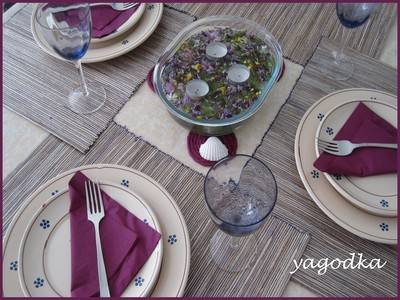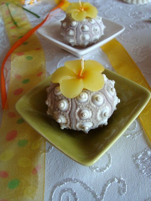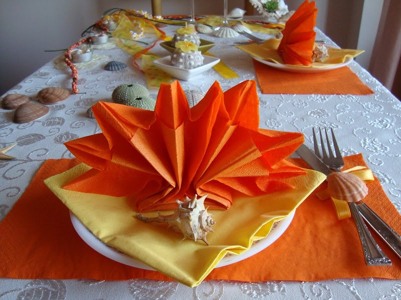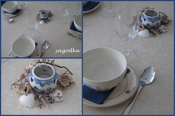 Салфетките си сгънала перфектно! Аз опитвах веднъж, но ми се стори много трудно и зарязах. Мидичките, рапанчетата, тези нещица в средата, свещичките - много красиво си ги подредила! Най-много обаче си паднах по цветчето в раковината, по мидичката върху приборите и по свещничетата мидо-цветенца!!! Много, много, много красива маса!!!