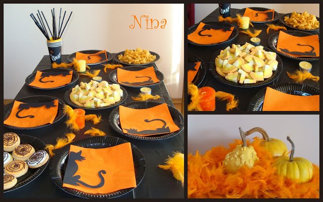 Сега от мен две маси в духа на Хелоуин- едната е за трима, а другата за гости. Темата на празника беше котки и затова те са водещ елемент. Изрязах от черен картон и залепих големи котки отстрани на вратите, но забравих да ги снимам. Имаше и покани с котки, свещи, свещници, сандвичи...