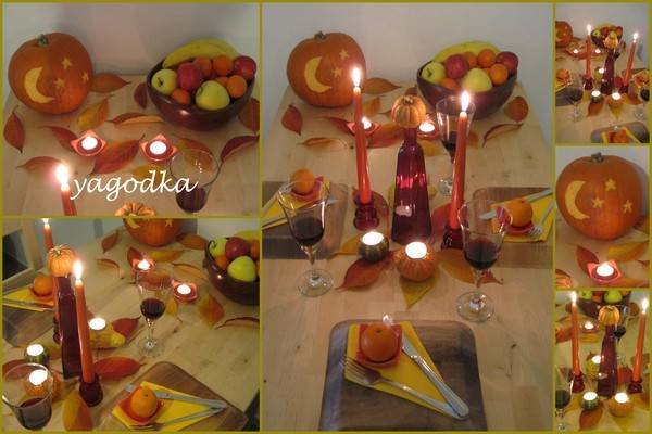Ягодка, есенната ти маса е много натурална.С дървената ти маса,чиниите,листата и плодовете...всичко е толкова природно.Тиквата е много добре изрязана. Миналата година и аз изрязвах малки тиквички като твоите с чаените свещи.Много нежно стоят.