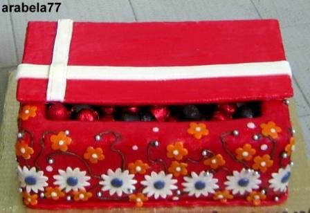 Катя,да е жива и здрава именни4ката(и мойта щерка имаще имен ден ,но след голямо умуване избра сладоледена торта).Много хубава торта,а 4ервеното е супер.....в котвата имаше Шиш4е и беше много стабилна