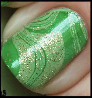 TheBlackWidow, мисля, че рабрах какво питаш  Laughing Има един светло зелен, един тъмно зелен и един чисто златен брокат на China Glaze в тази смес. Ето цялата статия: http://www.alllacqueredup.com/2010/04/water-marble-manicure.html