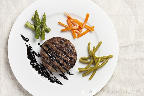 говежди бифтек от кълцано месо на грил със задушени зеленчуци и балсамова редукция с трюфелов аромат