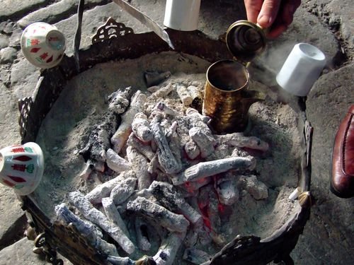Ама , всъщност това не  ли все едно нашенското кафе на пясък ,но без подправката  ?Освен въглените и пепелта ,като че и пясък ми се види в тепсията ...или се лъжа ....