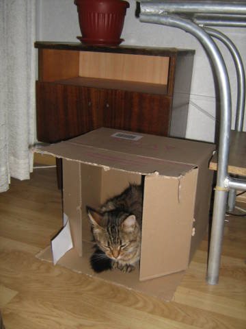 Кашончетата са класика в жанра. Радвайте се, че само спят в тях- Снежинка види ли кашон изпада в транс и моментално отива да го яде- гризе и плюе хартия наоколо  Close Всичките ми кутии за обувки изяде  Twisted Evil
