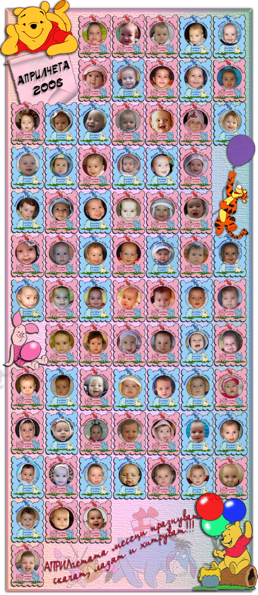 Привет мацки, попаднах на една стара тема с колажа който правих. Стана ми миного интересно и дълго оглеждах снимките на сладките ни бебоци тогава, сега вече малки деца. Колко много имена има от този колаж, които не съм срещала тук да пишат от година...  Sad Sad Sad