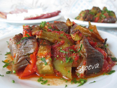 Дес рецептата е за около 15 буркана.4 кг доматки изцедени,5 кг,печен пипер,6кг печен патладжан и 2 кг задушени на едро тиквички.Смлените доматки се варят,докато им изври соса,прибавят се минатите през блендер други зеленчуци + 2/3 бутилка олио.Подправям с риган,босилек,целина и люти чушлета.