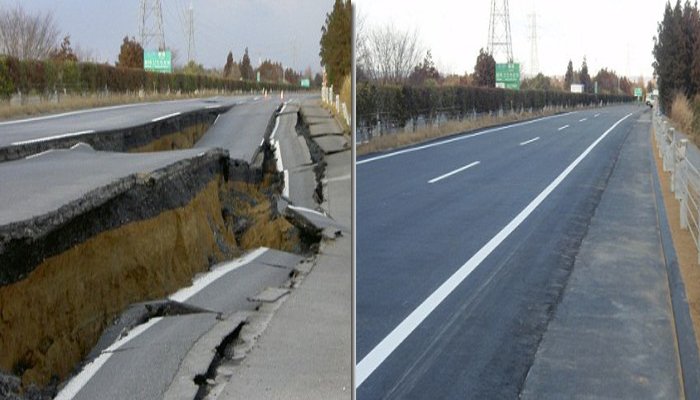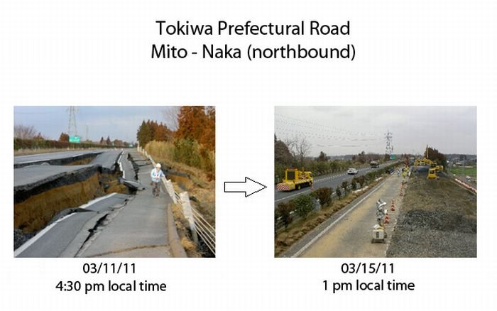 От ляво е пътя, раzруШен от бедствията на 11 март, от дясно е съЩият път пуснат в експлоатация на 23 март. Строителните работи са zапочнали на 17 март и само zа Шест дена японците са оправили таzи раzвалина. Невероятно. Респект!!!!