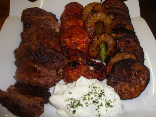 Пуешки гърди с пържен патладжан,домати, ананас, люта чушка и снежанка!