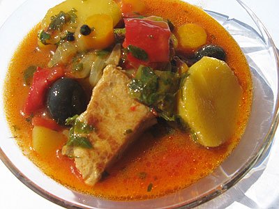Месото се задушава предварително. Задушават се лука, морковите, чушките. Добавят се картофи, дюля, маслини, домати. Сол, червен пипер, чер пипер, магданоз.