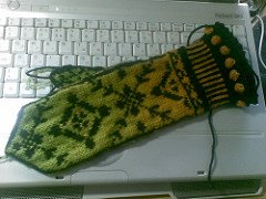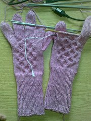 Довърших лявата каунска ръкавица, поплетох и розовите... Така се увлякох, че докато се сетя да снимам и бяха почти готови.