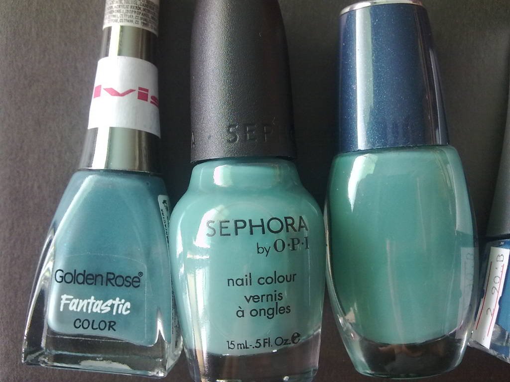 И държа да покажа двата си лака, дето ги бях забъркала в търсене на онзи мътен сиво-синьо-зелен цвят на Misa Dirty Sexy Money, чийто аналог на Сефора имам от Пампита Hug