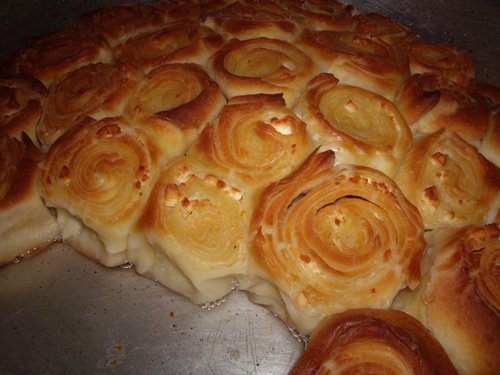 Изважда се тестото и се разстила върху леко набрашнена плоскост, разточва се правоъгълник с размери 30Х20 см, намазва се с по-горната смес и се навива на руло, което се разрязва на парчета, около1см дебели Подреждат се близо едно до друго в намаслена тава(но не плътно), покриват се и се оставят на топло да втасат, докато увеличат двойно обема си, приблизително около 40-50 минути. В някои рецепти се слагат във формички за мъфини.