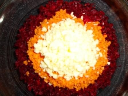 Искам да ви покажа моя любима салата от цвекло, моркови и кашкавал, която съм си нарекла Трицветна салата, а за по-кръвожадните може да става и "четирицветна" Wink: