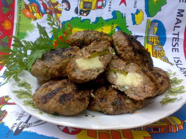 Кюфтета на скара с пълнеж от парченце кашкавал и кисела краставичка