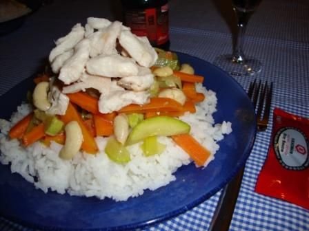. Настоящото пиле е гарнирано с микс от моркови, тичвички, праз лук и кашу (всичко на ивички), нямах гъбки. Тайната на ивичките пиле е, че се слагат на силно нагрят котлон да се запържат-задушат на "бърз огън".
