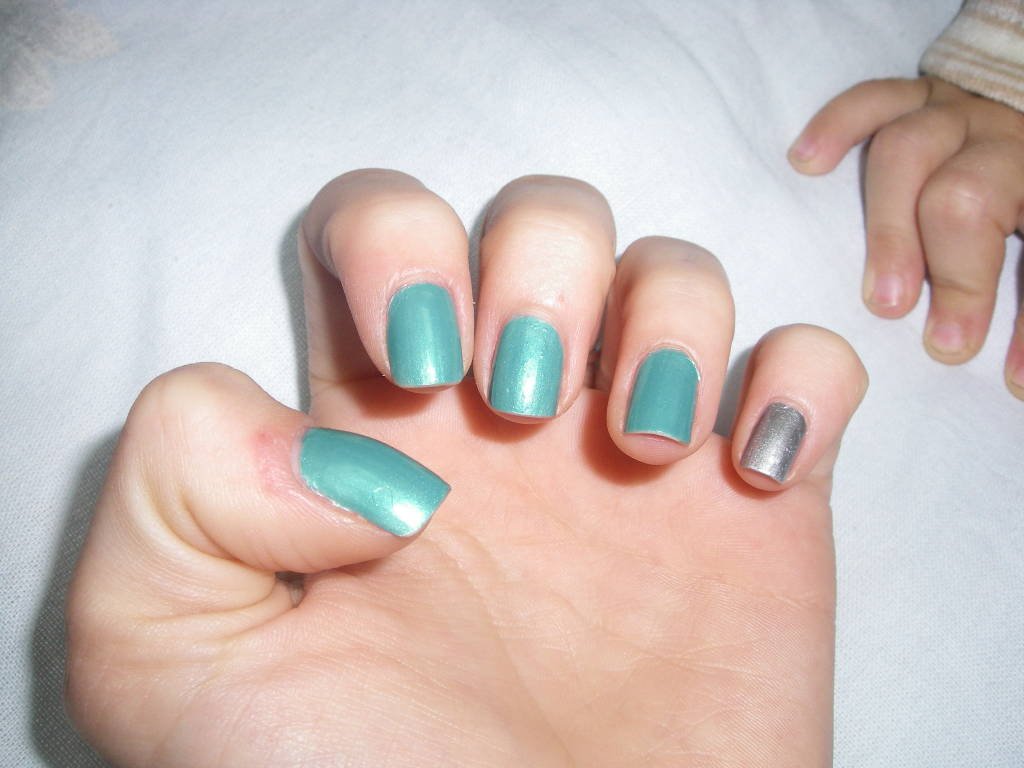 напоследък започнах да нося често синьо, зелено и тюркоазено (това ли е точният превод на teal?) - по принцип харесвам тъмните тонове, мента не бих пробвала, имам един нещастен опит с едно бебешко синьо на perfect, което изхвърлих след първото лакиране, не е за мен (: странно за мен повече като че ли се възприемам със синьо. а по принцип нося предимно тъмни тонове (rimmel - go cobalt например), най-светлото, което съм носила, е светлосиният холограм на catherine arley.