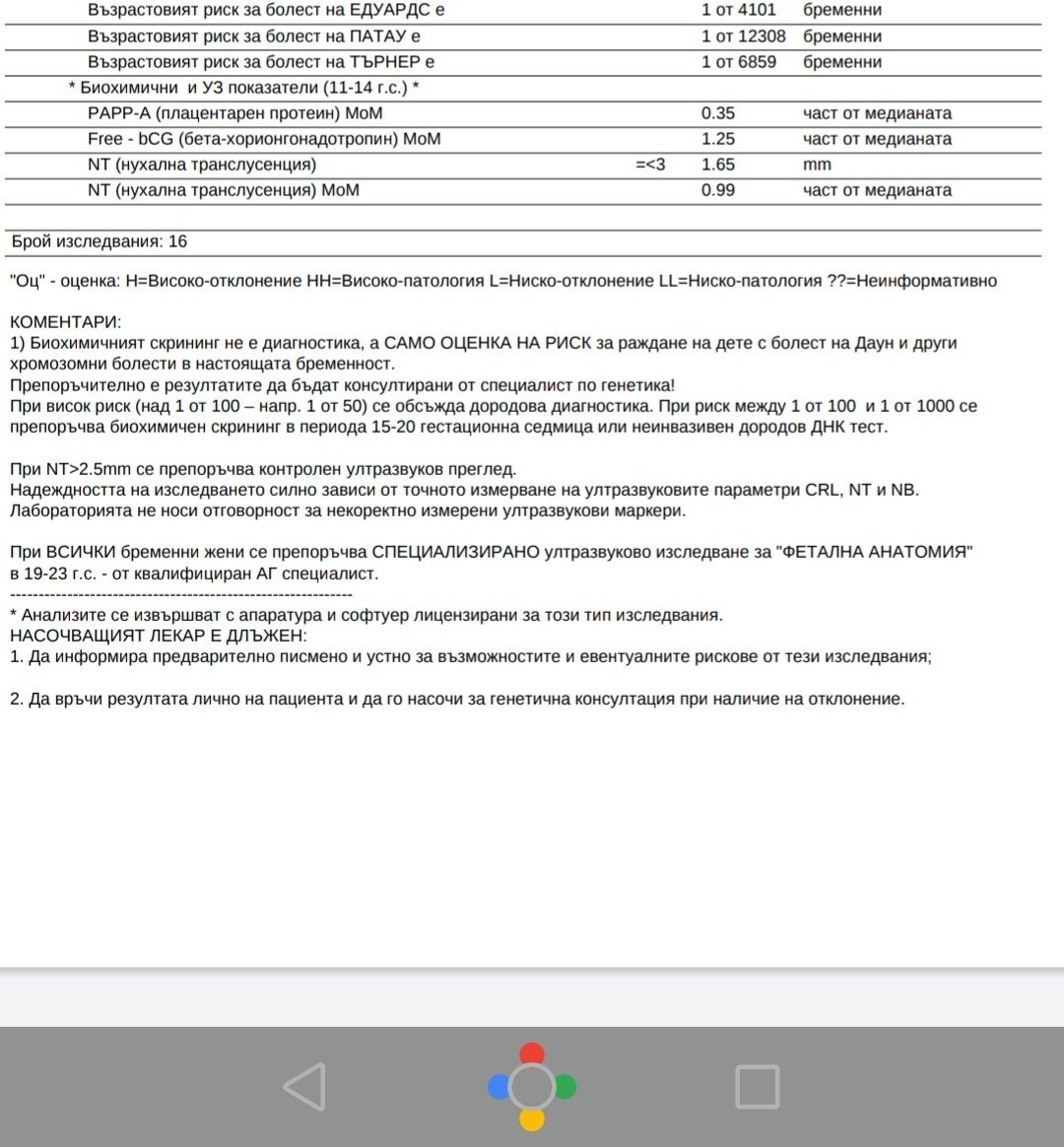 t.d.dimitrova, при теб няма PIGF. На мен PAPP-A и Free bCG са ми с други стойности в цифри, но там нямам референтни стойности и не знам дали са били в горна или долна граница. Но те 2те мисля, че са за хромозомни аномалии.