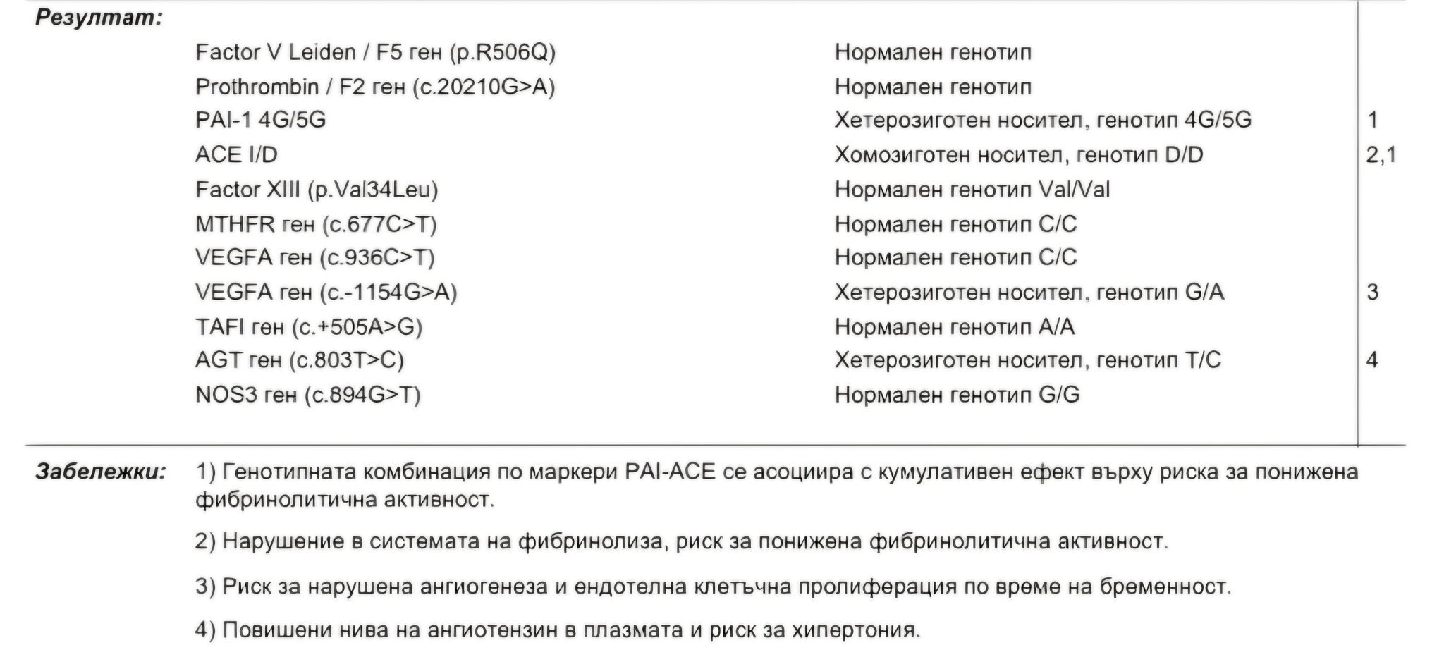 Вчера бях на хематолог и за себе си намерих причината. Тези мутации водят до високо кръвно и проблем при съдообразуването, какъвто има при мен в плацентата. Също така се разрових в изследванията на БХС и виждам, че PIGF ( плацентарен растежен фактор ) ми е бил 22 при реф.стойности 28,8 - 122, но никой не му е обърнал внимание, а това е било знак за плацентарна дисфункция и прееклампсия. Имала съм риск за ретардация 1:150, което според мен е омаловажено, защото никой нищо не ми каза, а в последтвие точно това се случи. Опитвам се да си разчитам и други неща по прегледите, но не всичко мога. Бях се доверила на докторите, защото оставях една камара пари по прегледи, фетални и т.н. и мислех, че обръщат внимание на всичко. Ще го обсъдя с някое АГ по-натам като се спра на някой читав.