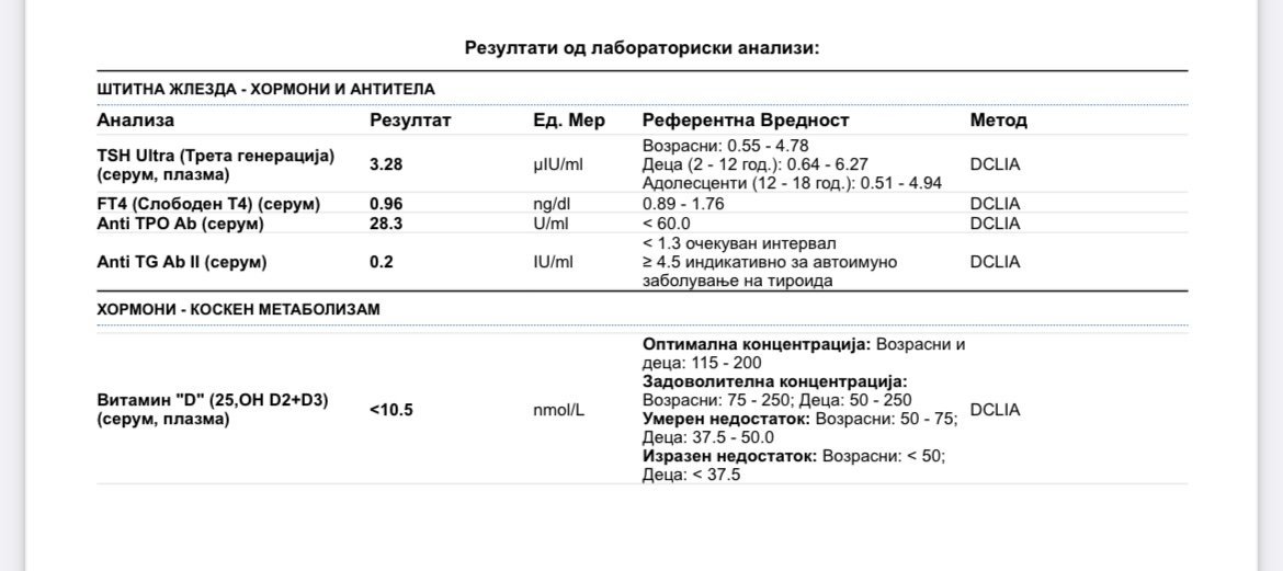 Хипофункция на щитовидната жлеза, необходима е консултация с ендокринолог. И да - за вит Д трябва да се вземат сериозни мерки.
