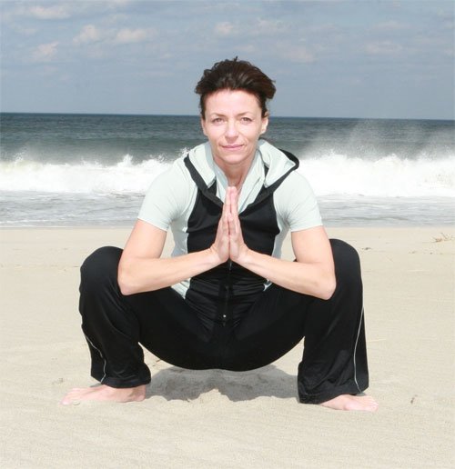 Елениа, да ти кажа, и моят корем расте с някаква шеметна скорост, ама не си давам сметка, защото килограмите все още са прилични - +7. Но от няколко седмици ходя на йога (обикновена, не за бременни, защото на тази за бременни й смениха часовете и не са ми удобни), и миналата седмица уж всичко си беше наред, правех си аз внимателно и предпазливо упражненията, а вчера  #Crazy Ами аз не мога да се сгъна! А се наведа напред, а коремът ми опре или в бедрата, или в гърдите  Laughing Идва инструкторът и ми казва: ако леко сгънете колената, ще ви е по-удобно. А аз викам "Да, ама не мога, щото коремът ми подпира" Laughing И той се хили  Joy Има едно упражнение, което е много хубаво за тазовото дъно - разтваряте широко краката, клякате с колене, сочещи навън, и стъпили на цяло стъпало, и се подпирате с ръце между краката. Лактите натискат колената навън, а дланите са събрани като за молитва. Ох, как го обясних само, ето за това става въпрос (едвам намерих картинка): Да, ама вече като клекна, коремът ми не се събира между краката, а повече не мога да ги разтворя, да не съм балерина! Ужас ви казвам...