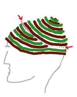 Линията върви по диагонал, тъй като ниските пълнежи в долната половина на шапката не обикалят, ами се наслагват. Къс ред, следващият е малко по-дълъг ред, още по-дълъг... и така, докато се затвори кръга и се продължи с обикаляне на цялата шапка.