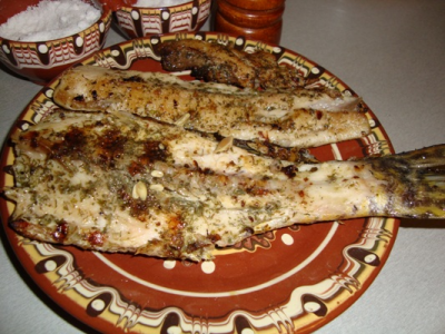 Да си покажа рибката от понеделник - печена щука на тиган. Едни кюфтета, една от туршиите - зеле и лукчета.