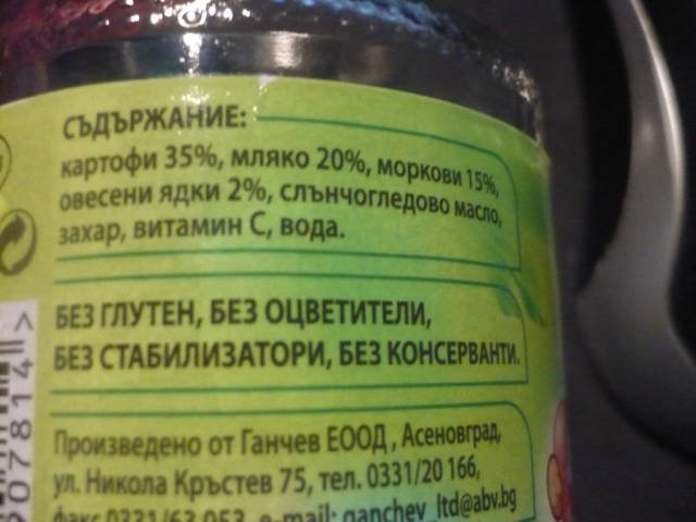 Пише добавен витамин С, а отдолу - без стабилизатори и т.н. Само че под "витамин С" се крие аскорбинова киселина - регулатор на киселинността. Не че в другите марки пюрета го няма, но те не пишат поне такива противоречиви неща.