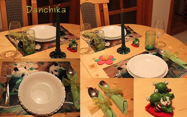 Данчика, много ме радват твоите маси - хем закачливи, хем милички, хем симпатични! Личи си, че влагаш много желание в аранжирането им! На първата много ми харесаха подложките-панди, малките жабки - жестоко сладурски са!!!, свещичката-цветенце, но най-много ме трогна как си обвила лъжицата със салфетка и си я вързала с тези много нежни панделки! Масата за гости също е много симпатична с тези свещички-топки , герберчето и салфетките с герберчета! Браво!   bouquet