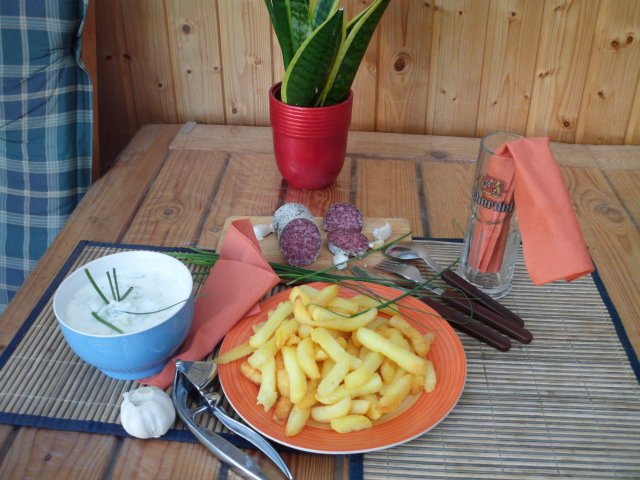 Селска маса  и много чесън и златни картофки и унгарски салам Heart Eyes