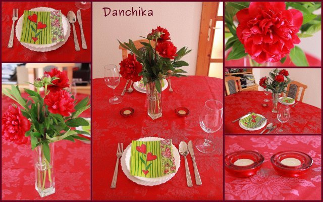 Новата ми маса има и нов букет, много си го харесвам от "проектосвекъра" ми е. Получи ми се червена масата, случайно стана, заради красивия Божур