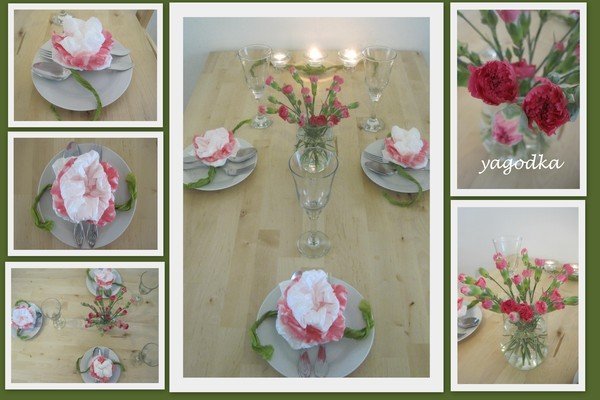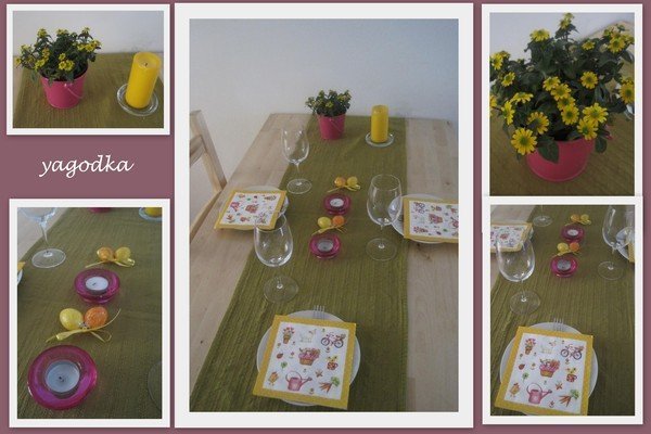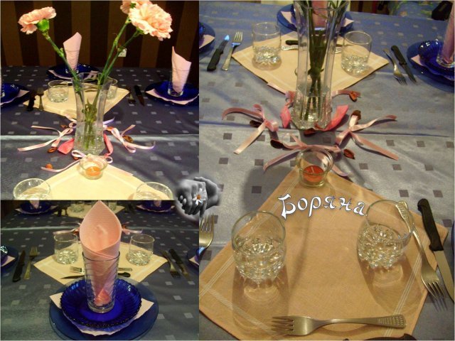 От мен снощната маса за гости. Искам да се извиня за некачествените снимки, на които не може много да се разбере кое какъв цвят е, но аз се постарах всичко да си е в тон и се получи това:
