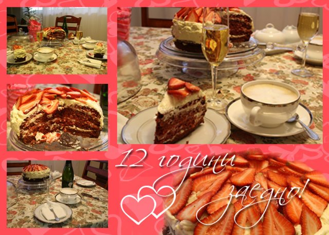 Какво съвпадение, и ние имаме днес годишнина. Още не съм подреждала масата за вечеря, само следобедно шампанско с тортичка: