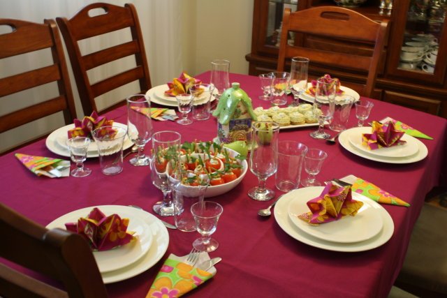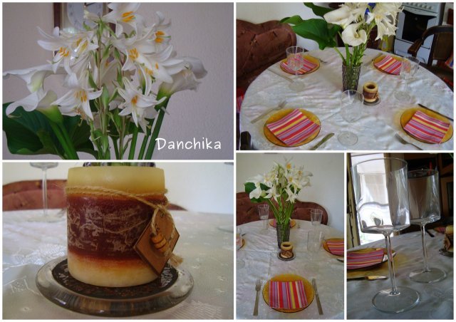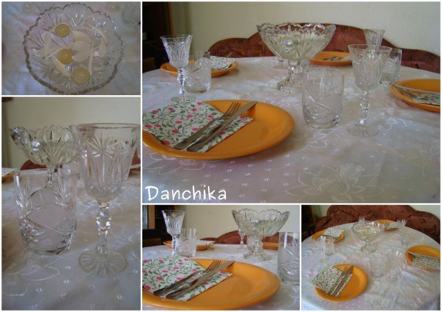 Мили другарки-аранжорки какви красоти сте сътворили пак! Минавам набързо само да се отчета с една скромна маса, нещо се изчерпах вече Sad Ще поствам оттук нататък само като преценя, че си заслужава. Тази маса беше вариант номер 1, после се обадиха, че ще идват още гости и трябваше да разваля всичко, да разпъна масата, да метна по-голяма покривка и да пренаредя, както и да се погрижа за допълнителни прибори и салфетки... за някакви си 20 м. ooooh! Много не си падам по такива изненади, ама иначе си прекарахме страхотни и не съжалявам. Обаче не можах да направя снимка на втората маса по обясними причини Laughing