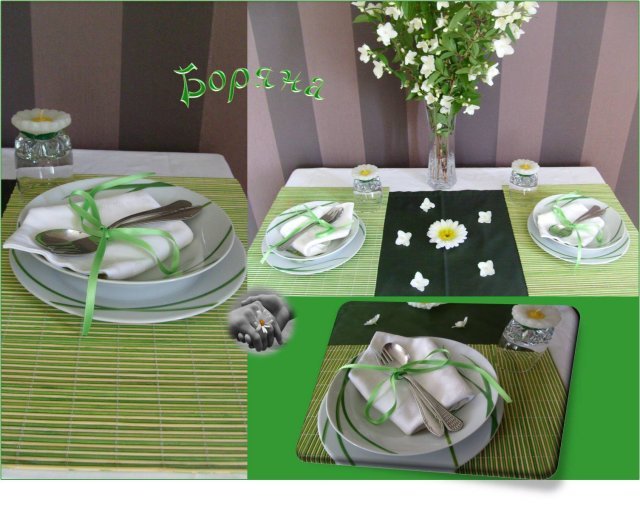 Боре- какви са цветята във вазата? - не съм попадала на такива, прекрасен букет. Обожавам ти свещите които са като гербер, много са  красиви. Лъжичките и салфетките са много китно поставени в чинииките, вързани нежно с тази зелена пандела Flowers Bouquet