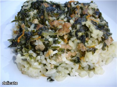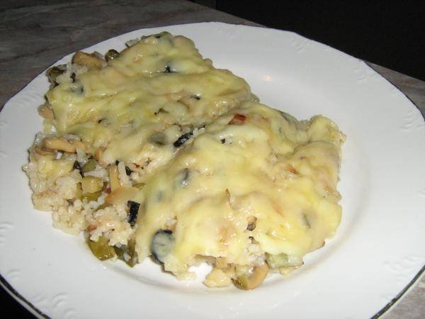 -  Задушен ориз с лук,гъби,кисели краставички,маслини и кашкавал.