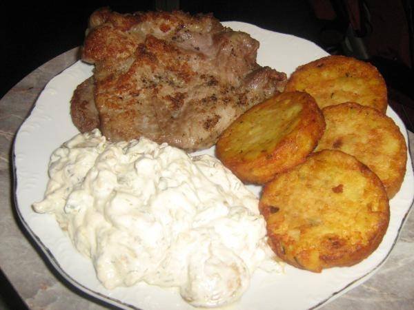 -  Пържола с картофени кюфтета и тиквички с кисело мляко.