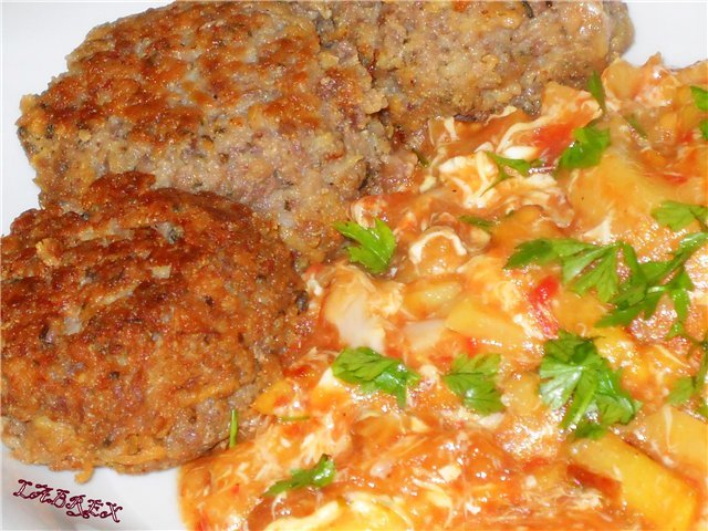 У нас снощните кюфтенца с доматен сос с яйца и пържени картофки.