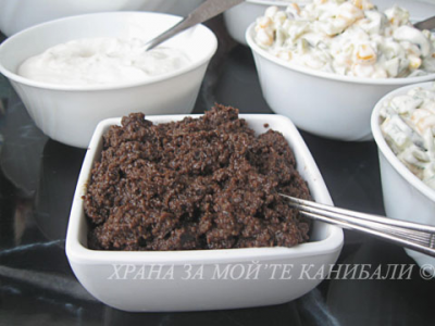 А пастета е от сварен черен боб /става със всякакъв/ ,подправен на вкус с чесън ,сол ,черен пипер, зехтин и пюриран.