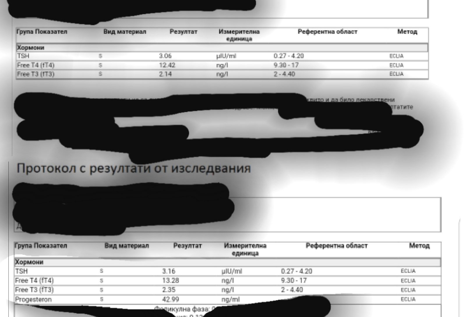 Бях на еутерокс 25 мг и 50 мг през ден. Забременях в началото на втория месец съм. Правих си контролно изследване TSH  преди 10 дни и ми беше 3.16, вдигнаха ми дозата на 50 мг всеки ден. Днес си пуснах пак 10 дни след като ми увеличиха дозата. Пускам ви снимка - долната е първа, горната е от днес. Много се притеснявам, дали не трябва да пия по-висока доза.