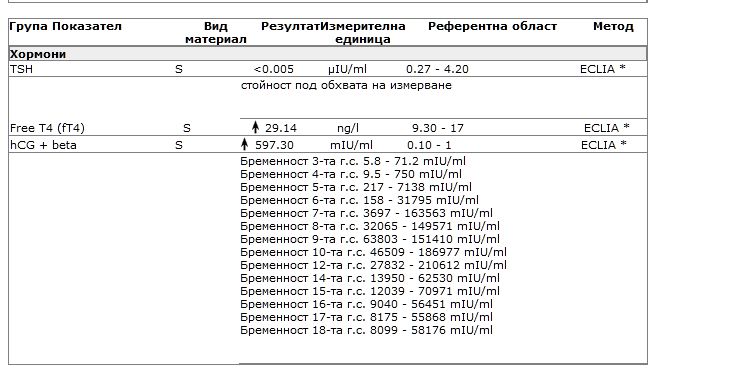 При първата бременност се установи високо ТСХ - малко над 3 и започнах да пия Л-тироксин по препоръка на лекар - д-р Шигарминова от Вита. При ехографията, заяви че съм имала изменения на щитовидната, които приличат на Хашимото, но засега съм нямала тази диагноза.
